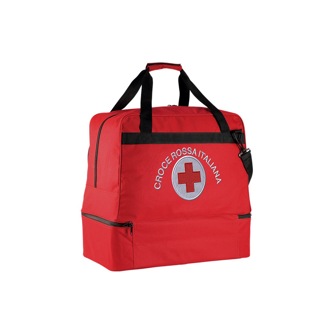 Large nylon-cordura duffel bag, size 50x65x26 cm, rigid shoe compartment at the bottom, 3M reflective trim colour silver, padded shoulder straps, frontal Red Cross embroidery. Fully customizable.
